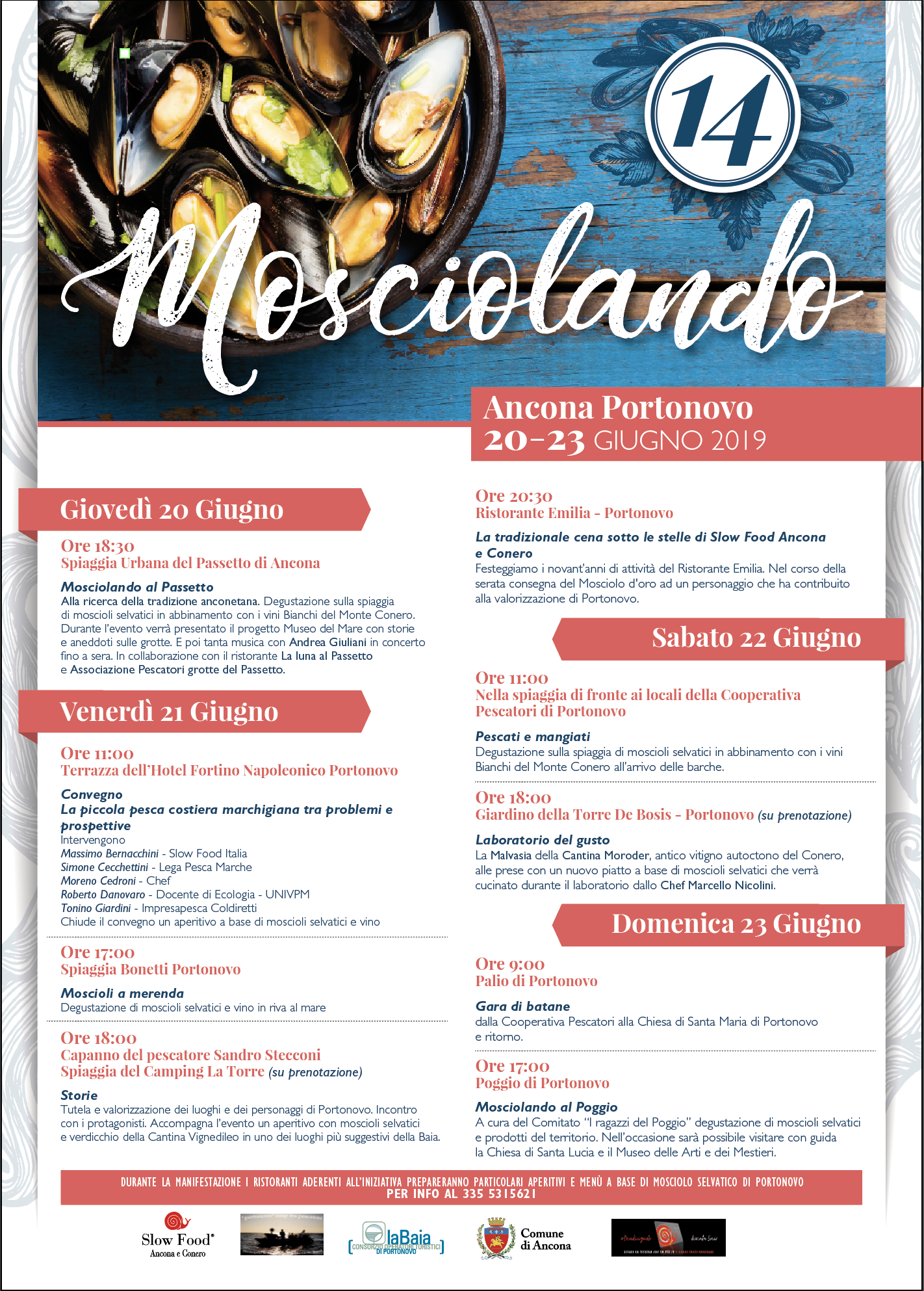 Degustazioni in spiaggia, convegni, abbinamento moscioli e vino, racconti di pesca e pescatori, laboratori del gusto e i tradizionali appuntamenti con “Cena sotto le stelle” e “Pescati e Mangiati”.